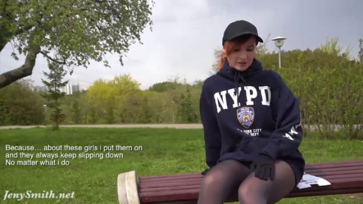 Naughty Lada wearing seamless pantyhose takes off her skirt in public place