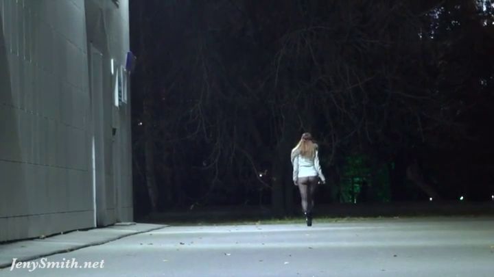 Jeny Smith posing in her black seamless pantyhose in the industrial entourage